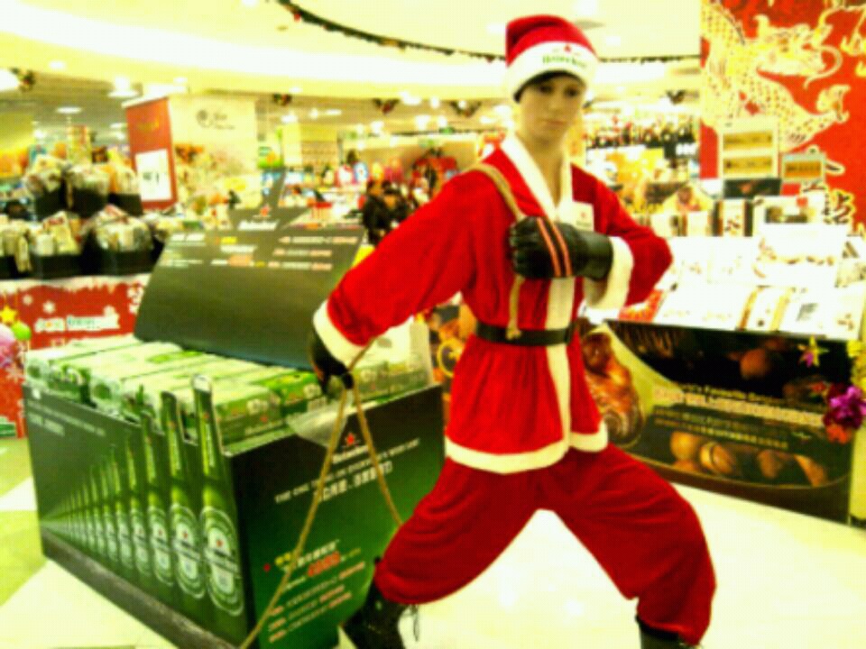 これなんだか分かりますか?サンタ服を着たマネキンがソリを引っ張っている光景です。初めて見たときは、ずっこけそうになった群青です(爆)