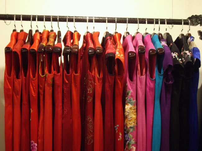 色とりどりの旗袍は全て良質な緞子(ドゥァンズ)を使って作られた一級品。仕立て料は8万円と確かに高価ですが、以後体型が変化したときのお直しはなんと全て無料♪更に追加料金(約1500円=2万円)で手工刺繍がふんだんにあしらわれたショールを仕立てた旗袍に合わせてデザインし、新たに製作してくれます。