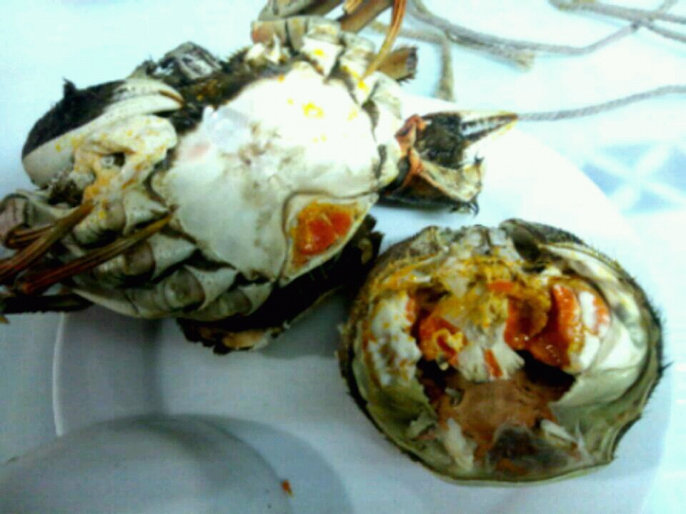 見えにくいですが、お腹にたっぷり乗った半透明の白いもの、これが膏(がお)と呼ばれる部分です。これは魚では白子に当たり、黄(ホァン)に比べると幾分か脂濃く、少し癖のある美味しさです。両方ともこの時期限定の珍味ですので、機会があればぜひ後堪能あれ☆