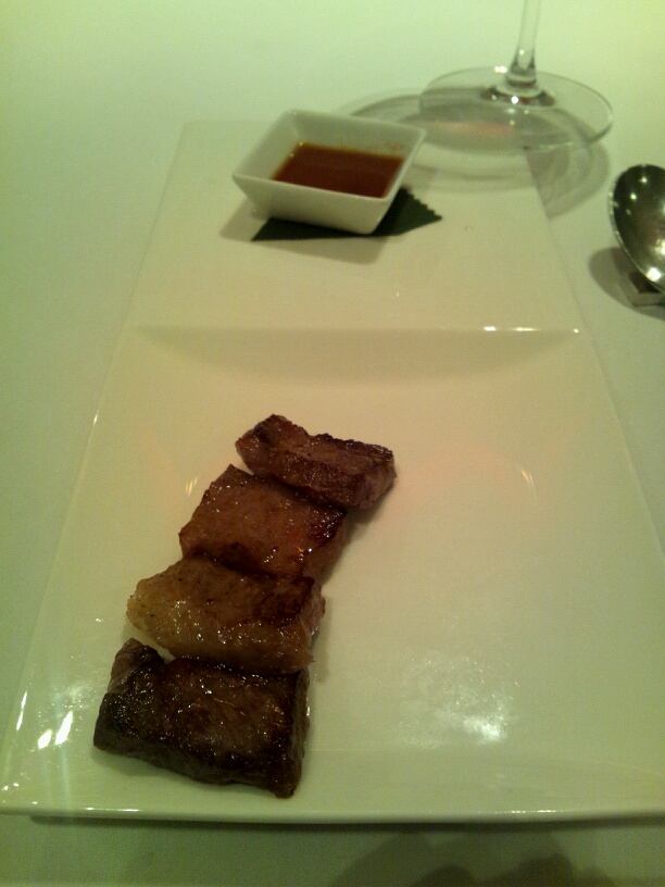 主菜一品目は霜降牛肉のステーキ。