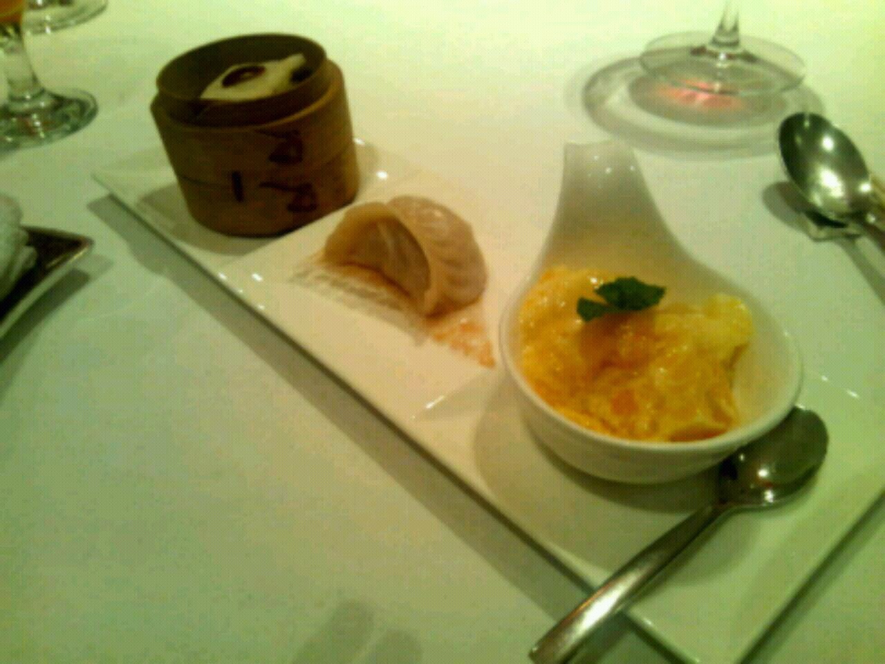 デザートの点心は奥からそれぞれ、棗の蒸しケーキ、蒸餃子、マンゴー杏仁豆腐。